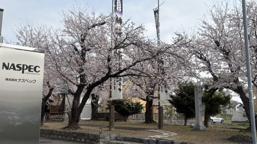 ナスペックではお隣の神社の桜が見ごろで、お仕事しながらでも桜を眺めることができます。