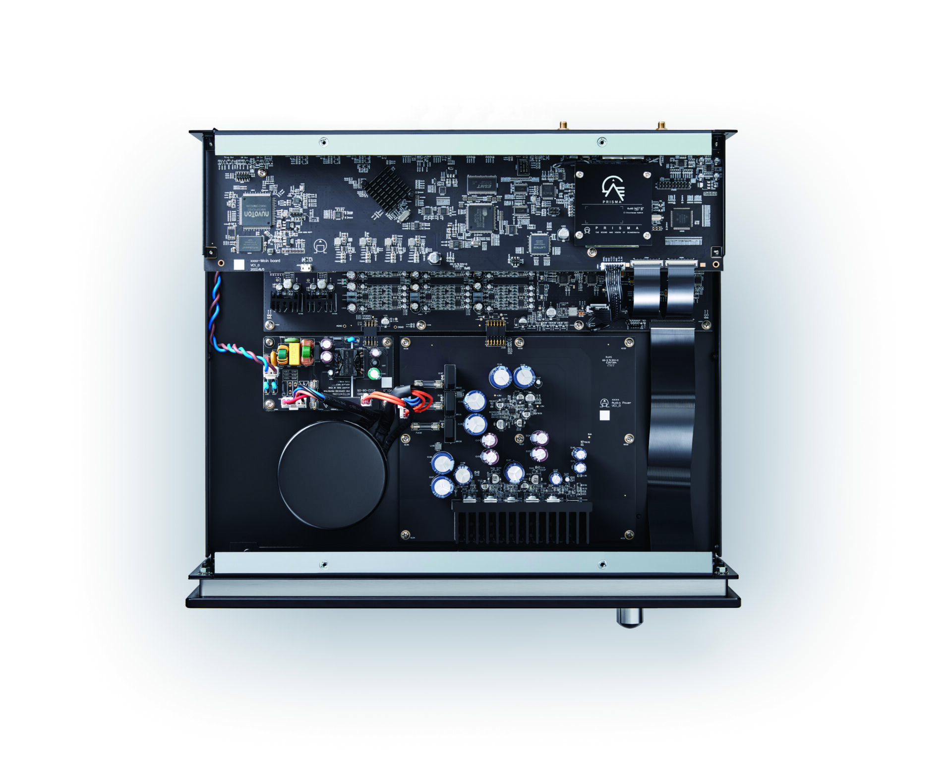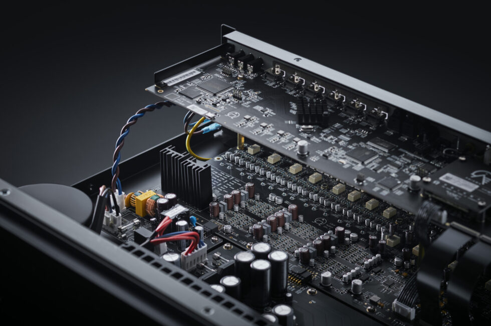 電源は、オーディオ処理、デジタル・アナログ変換、ビデオ・スイッチング、ストリーミングといった機能に必要な電力を低ノイズで供給するために特別に設計されました。また、特にプリアンプのために別の電源が用意されており、より高品質な音を提供します。